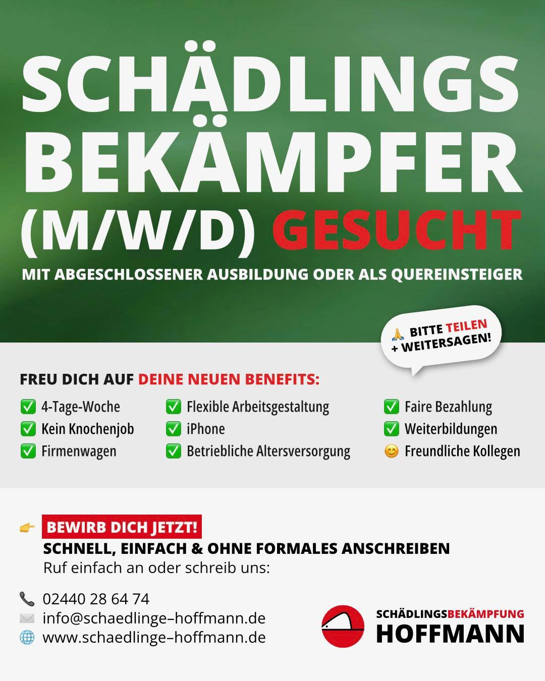 Schädlingsbekämpfung Hoffmann sucht zur Verstärkung des Teams einen Schädlingsbekämpfer (m/w/d) – entweder mit abgeschlossener Ausbildung oder als Quereinsteiger mit handwerklichem Geschick und Lernbereitschaft.